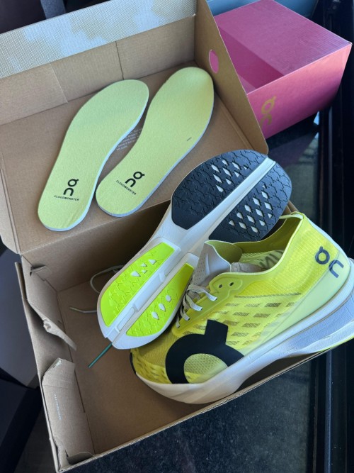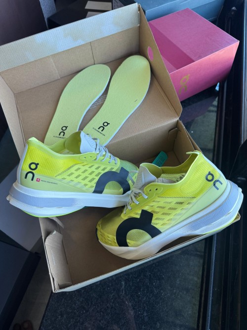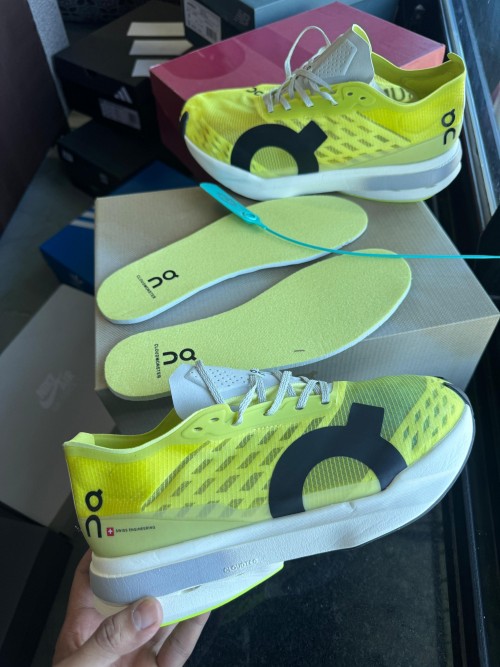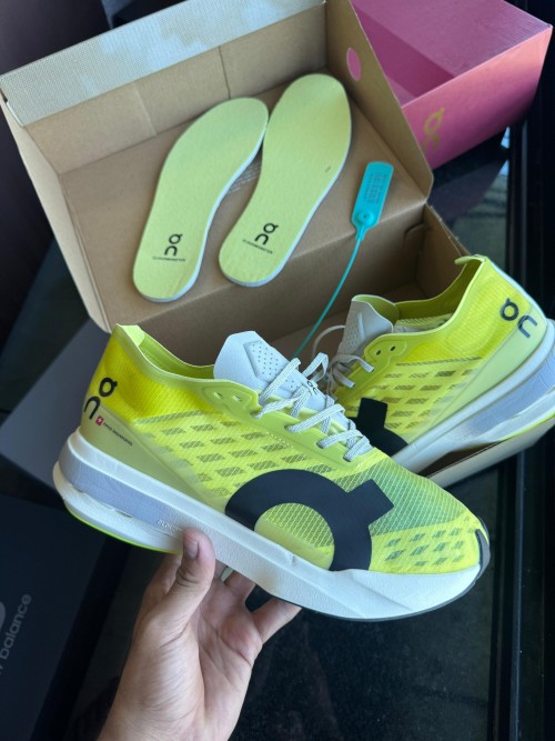 The On Running Cloudboom Strike Limelight Wolf is a high-performance racing shoe built for maximum speed and efficiency, designed to meet the demands of elite marathoners and serious competitors. Its upper features a translucent, ultra-lightweight mesh in a vibrant limelight yellow, accented by tonal overlays and a soft grey "Wolf" hue that lines the collar and heel for subtle contrast. The minimal construction enhances breathability while maintaining a race-ready lockdown fit, supported by precision-placed reinforcements around the midfoot and toe box. The midsole showcases a powerful blend of Helion™ HF hyper foam and a carbon-infused Speedboard®, strategically tuned to deliver aggressive propulsion and energy return during high-tempo efforts. Underfoot, the outsole incorporates a segmented rubber pattern that optimizes grip and flexibility, especially useful for varied road surfaces. With its rocker geometry and stripped-down aesthetic, the Cloudboom Strike offers an explosive ride designed for chasing PRs, making it an ideal choice for long-distance racers who prioritize lightweight responsiveness and race-day focus.